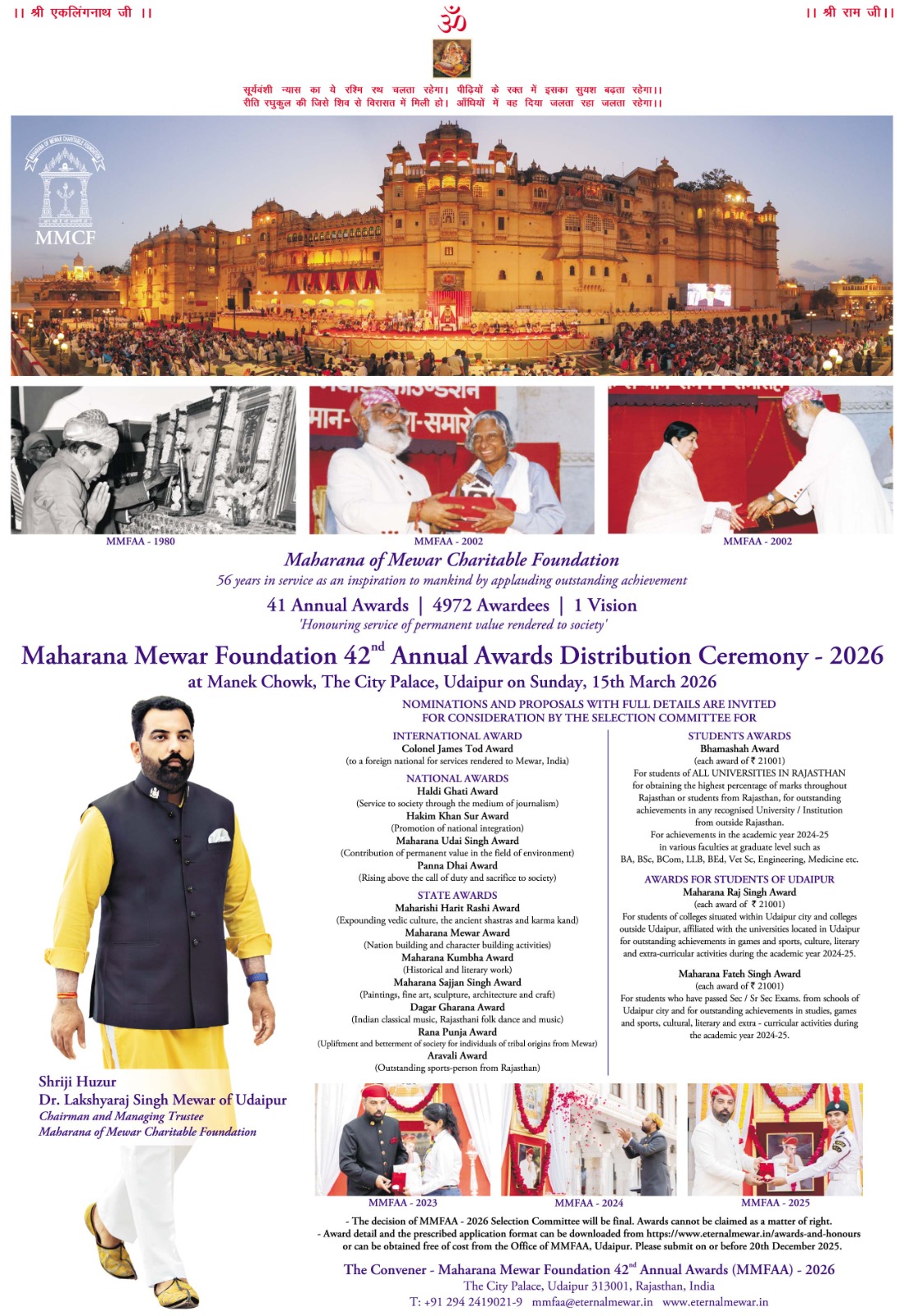 उदयपुर, 3 फरवरी: मेवाड़ के पूर्व राजपरिवार के सदस्य एवं महाराणा प्रताप के वंशज डॉ. लक्ष्यराज सिंह मेवाड़ ने मंगलवार को नई दिल्ली में सपरिवार प्रधानमंत्री नरेंद्र मोदी से शिष्टाचार भेंट की। संसद भवन में हुई इस भेंट के दौरान दोनों के बीच करीब आधे घंटे तक संवाद हुआ। पीएम मोदी ने उदयपुर आने का […]