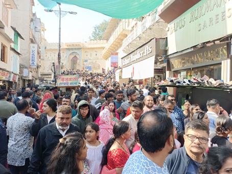 नाथद्वारा, 28 दिसम्बर: सर्दी की छुट्टियों के चलते विश्व प्रसिद्ध प्रभु श्रीनाथजी की नगरी नाथद्वारा में श्रद्धालुओं की अभूतपूर्व भीड़ देखने को मिल रही है। पिछले चार दिनों से लगातार दर्शनार्थियों की संख्या में भारी बढ़ोतरी दर्ज की गई है। रविवार को तो सर्दी की छुट्टियों के सभी पुराने रिकॉर्ड टूट गए। कई वर्षों बाद ऐसा अवसर आया है जब इस सीजन में इतनी बड़ी संख्या में श्रद्धालु श्रीनाथजी के दर्शन को पहुंचे। भीड़ को देखते हुए मंगला, राजभोग सहित अन्य झांकी दर्शन निर्धारित समय से काफी देर तक खुले रखे गए। दर्शनार्थियों की सुविधा के लिए पार्किंग सहित अन्य व्यवस्थाएं की गईं, हालांकि प्रवेश मार्गों पर पर्याप्त प्रबंध नहीं होने से श्रद्धालुओं को कुछ असुविधा का सामना भी करना पड़ा। मंदिर मंडल प्रशासन स्थिति पर लगातार नजर बनाए हुए है।